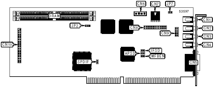 CD-ROM interface, microphone connector, line in connector, line out connector, speaker out connector, game/MIDI port, PC internal speaker, CD-ROM audio in connectors (2), feature connector