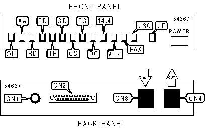 Line in (RJ-11), line out (RJ-11), DTE (25-pin serial connector)